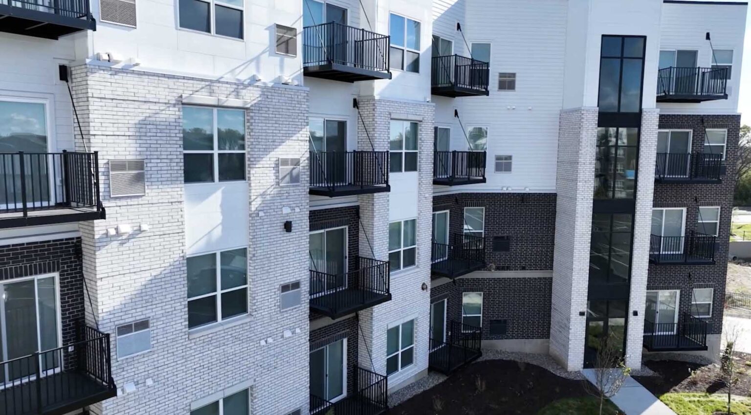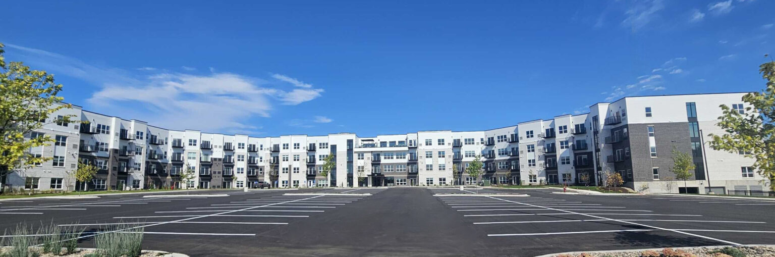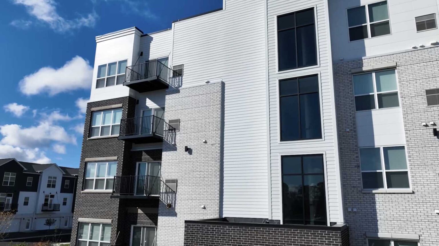 This modern development features a four-story apartment building plus a clubhouse. Our siding install included Nichiha Illumination Panels, Hardie siding, and EZ Trim Aluminum Channels. The design blends durability with sleek aesthetics.