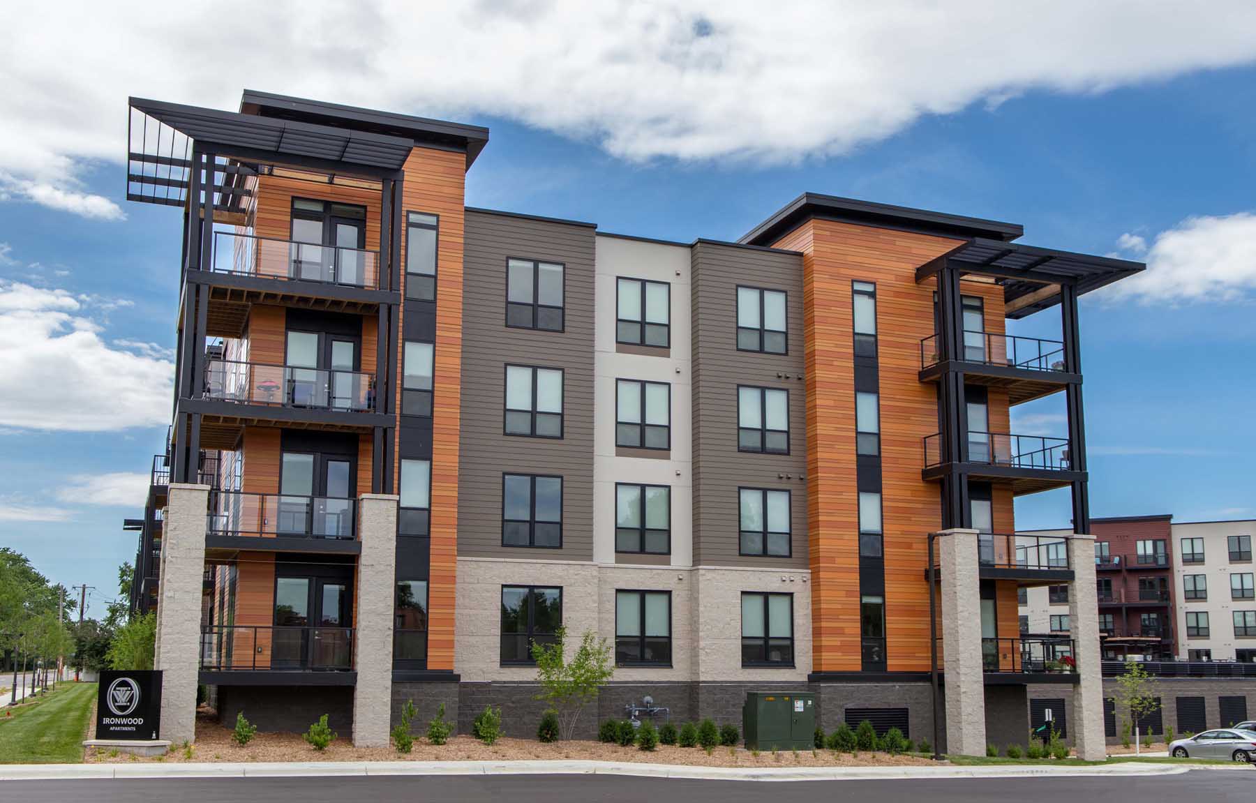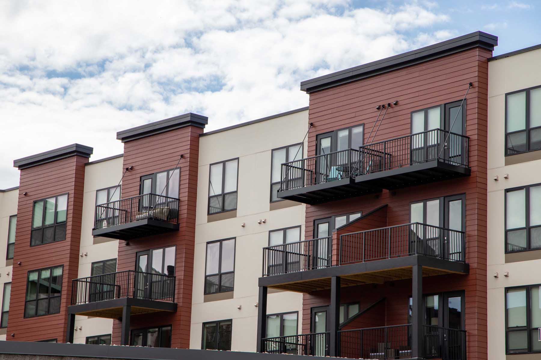 This apartment building features complex siding details including multiple different sizes and colors of lap material around the exterior.